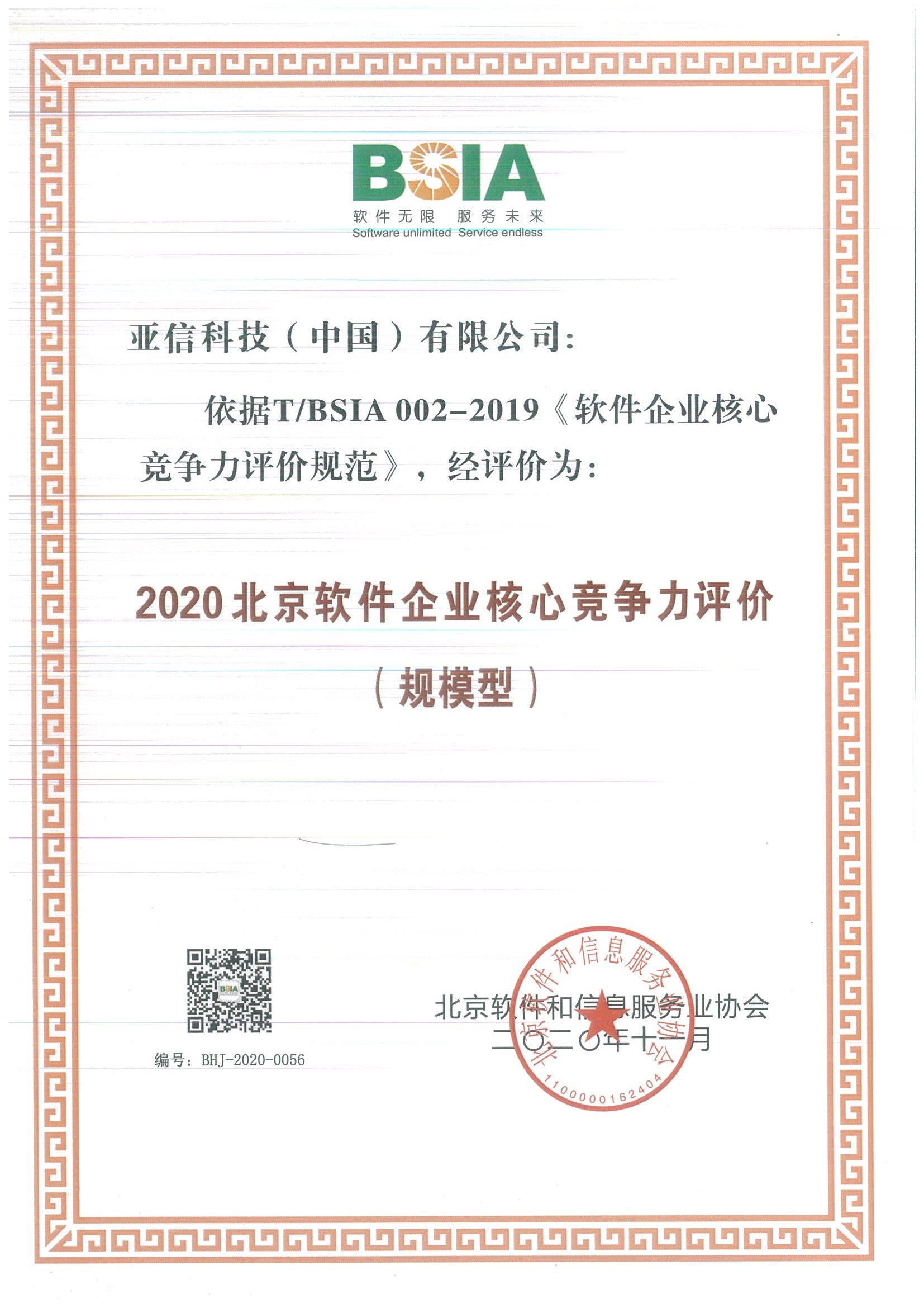 2020年11月 304am永利集团荣获“2020北京软件企业核心竞争力评价(规模型)”
