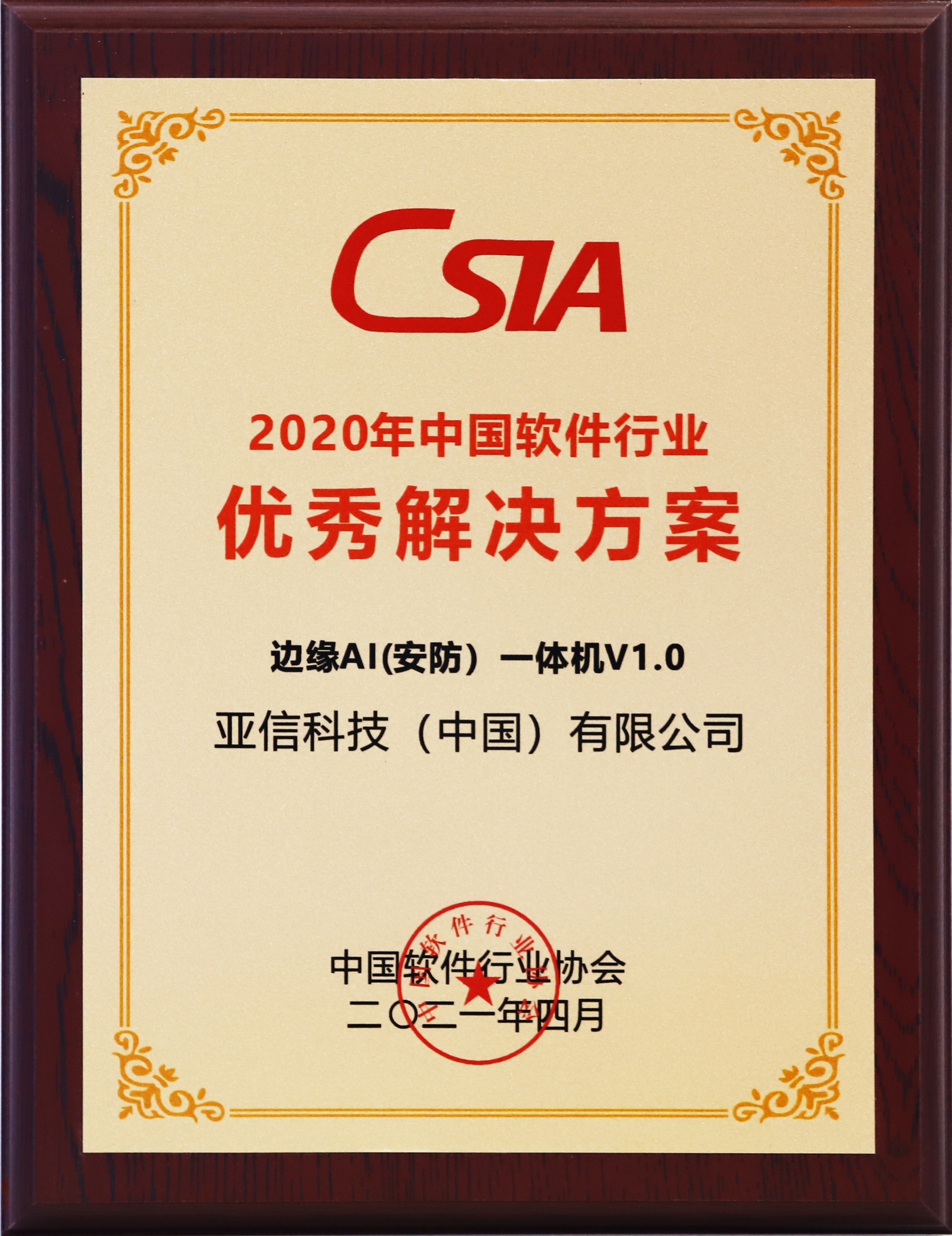 2021年4月 304am永利集团边缘AI(安防)一体机V1.9获”2020年中国软件行业优秀解决方案”